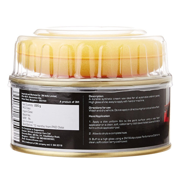 Gives your car a glossy finish A durable synthetic cream wax ideal for all automotive exterior paints Use 3M cream wax to protect your paint from the elements Remember to remove the tag before using and wash the cloth often (without fabric softeners or dryer sheets) to enhance effects