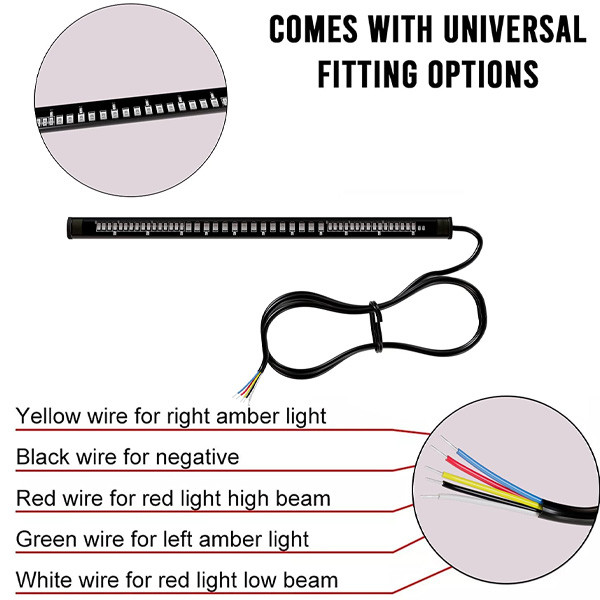 Multi-functional led strip: AllExtreme motorcycle flexible led has a streamer design that can be used for a wide number of functions like tail light, running and driving light, turn signal light, brake light, parking light, etc. an ideal safety and stylish motorcycle accessory : featuring epoxy process design, fuse overload protection and ip65 waterproof rating, the offered flexible led strip light is designed to prevent splashes, dirt, moisture, weather impacts and washes Perfect brightness: designed using 3528 super bright 16+32 leds to offer high-intensity lightening solution for your braking, indication, parking, drl and other needs ultrahigh visibility to warn the riders behind you to indicate braking and turn signal UNIVERSAL COMPATIBILITY – The offered taillight LED strip with braking and turn signal indicator can be easily installed on any make or model of motorcycle, scooty, scooter, ATV, UTV, car and even on commercial vehicle easily.