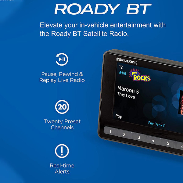 The SXVRBTAZ1 Radio comes with your choice of 3 months free or 12 months for $99 of our Platinum Programming Package. Experience over 425 Satellite and Streaming Channels for as low as $8.25 a month. Plus Fees & Taxes Elevate your in-vehicle entertainment with the Roady BT Satellite Radio Connect to your car’s audio system via Bluetooth audio streaming, Aux or FM audio output for instant access to SiriusXM