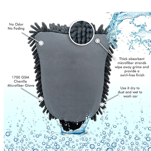 HIGH DENSITY, SUPER ABSORBENT - Our wash mitts Made of Premium Dual-sided high-quality chenille, Durable double-stitched elastic cuff, Can wear in hand and hold a lot of soap and water which means you do can cover far more of an area of whatever you're cleaning. MACHINE WASHABLE AND REPEATED USES - Our Microfiber Gloves is Machine-washable. And not just for car-washing & detailing, it can also be used to clean the interiors, furniture, glass windows, door, mirrors and more. LINT-FREE AND NON-SCRATCH - Premium Chenille Microfibre, lint-free, provide a swirl-free finish. More effective cleaning power than any car wash sponge and cloths-duster, Use indoors and out, wet or dry.